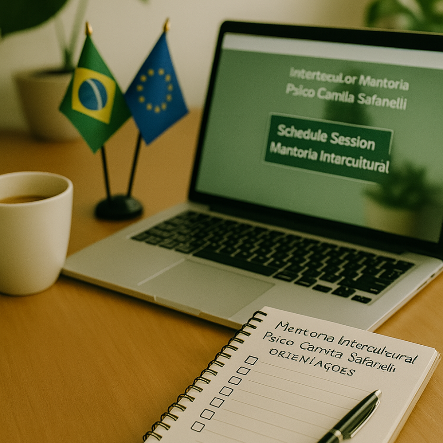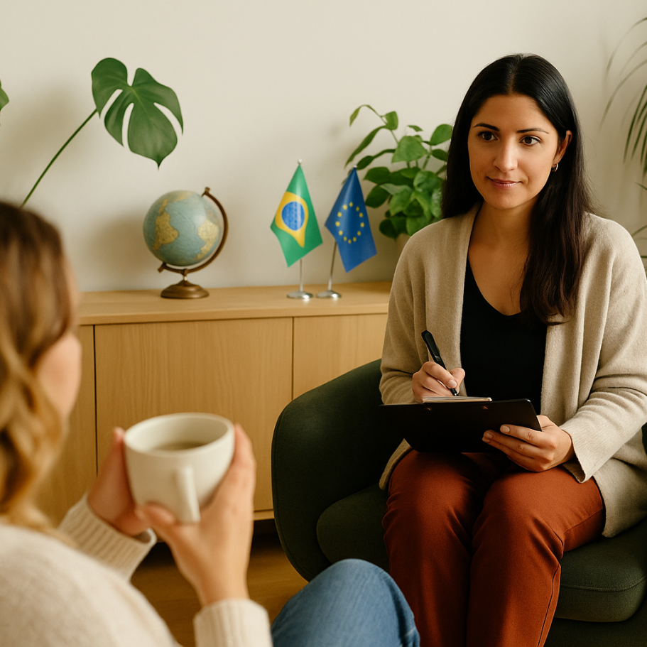 É um atendimento psicológico online, voltado a imigrantes brasileiros que vivem o desafio do luto migratório, da solidão e da adaptação cultural.